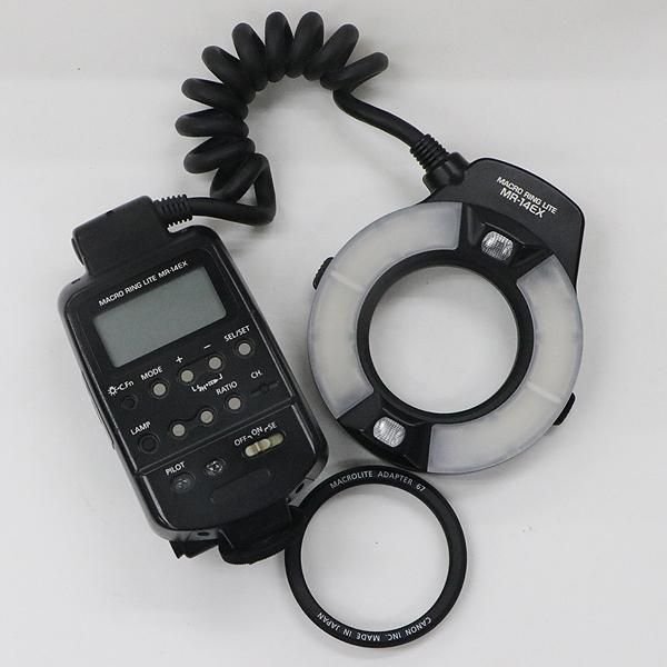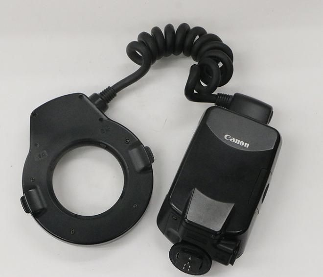 E−TTL、E-TTL2調光対応の接写専用ストロボ。発光部をレンズ先端に取付けるので対応レンズに注意。58mm径のマクロレンズはそのまま取付。67mm径にはアダプター必要です。